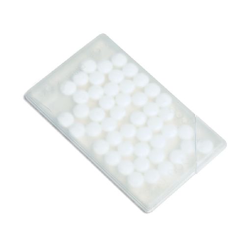 Caixa de caramelos em forma de cartão de crédito. 8 gramas de caramelos de menta incluídas.