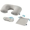 Este conjunto de viagem suave contém uma almofada de pescoço insuflável com um fecho azul claro, máscara facial com elástico azul claro e um conjunto de tampões de ouvidos azuis numa bolsa com fecho de cordão azul claro.Poliéster, Algodão Green Points Total :10 – CO2 foot print : 0,785Serigrafia – bolsa – max color : 1 – 80 x 80 mm.