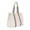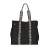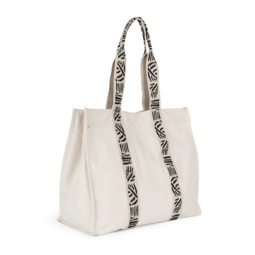 Bolso interior com fecho. Com materiais reciclados, 100% eco-responsável. Black Night: 285 gsm canvas: 67% algodão reciclado/30% poliéster reciclado/3% outras fibras. Ecume: 285 gsm canvas: 75% algodão reciclado/22% poliéster reciclado/3% outras fibras. As alças com cores em contraste apresentam grafismos de inspiração étnica e estão cosidas ao longo do corpo do saco, conferindo um toque de originalidade e uma maior resistência. O saco possui um bolso interior com fecho para guardar em total segurança as chaves e o telemóvel. Fecho com botão magnético. Certificações : Global recycled standard