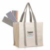 Saco em canvas com fole e fecho magnético. Este saco em canvas de cor natural e pegas de algodão contrastantes é, pelas suas dimensões, um saco que pode ter múltiplas utilizações, tais como saco de praia, compras, piqueniques, etc Possúi no interior um fechoi magnético e um bolso com zipper, que lhe permite transportar os seus objetos com maior segurança.