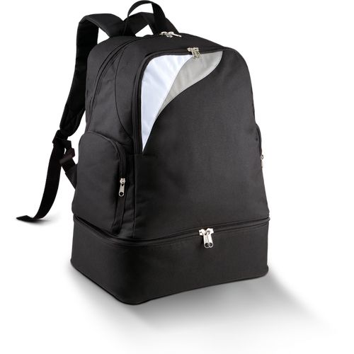 Utilização multidesportiva. Compartimento para calçado com fundo rígido. Múltiplos bolsos: bolso frontal grande com fecho, 2 bolsos com fecho de ambos os lados. Mochila para desporto (equipas) em poliéster 600D, fundo rígido ideal para sapatos, bolso frontal grande, bolsos laterais com fecho. 39 Litros