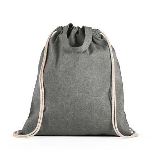 Saco tipo mochila com algodão reciclado (70%) e poliéster reciclado (30%) (140 g/m²), alças de 30 cm e cordões em algodão para fechar. 370 x 410 mmProperties : Produto amigo do ambiente, Our natureMaterials : Algodão. Algodão recicladoCertificates : REACH Default customisation : Saco – Frente (Serigrafia têxtil – 300 x 300).