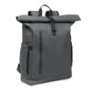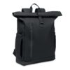 Mochila com fecho rolltop para portátil de 15” em RPET 600D revestido de PU e forro de poliéster RPET. Costas acolchoadas com malha, bolso com fecho e alça para trolley. Alça acolchoada com acabamento interior em malha.