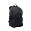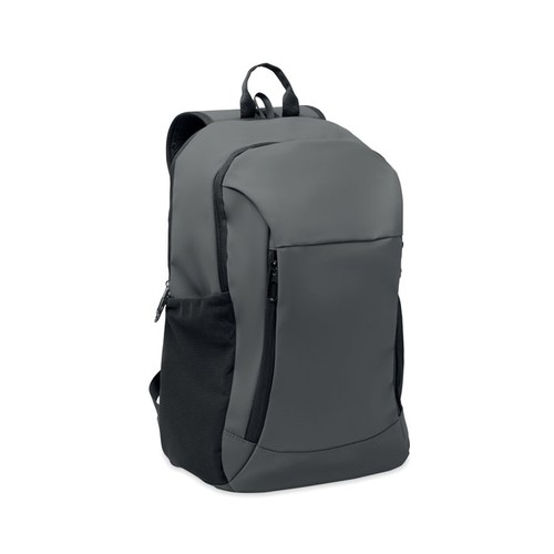 Mochila para computador portátil de 15” em PU macio com costas almofadadas e compartimento principal oculto com fecho de correr. 1 bolso frontal com fecho de correr, 2 bolsos laterais com fecho de correr e 2 laterais em rede elástica. Com forro em RPET 210D.