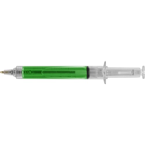 Esferográfica de plástico em forma de seringa. Escrita preto. Colors : azul claro Materials : AS/Cera Certificates : Cadmium (nr 2), PAHs (nr 4), Phthalates (nr 13), Safety Data Sheet (SDS) (nr 27), EN71-3 (nr 1), Lead (nr 19), BSCI (nr 195).