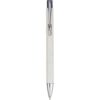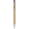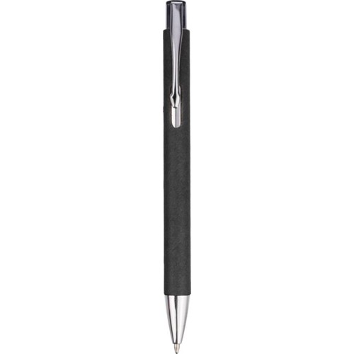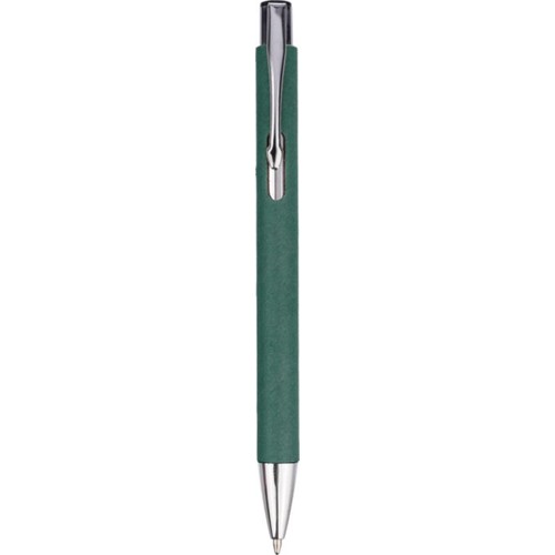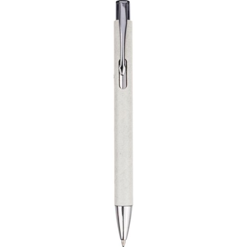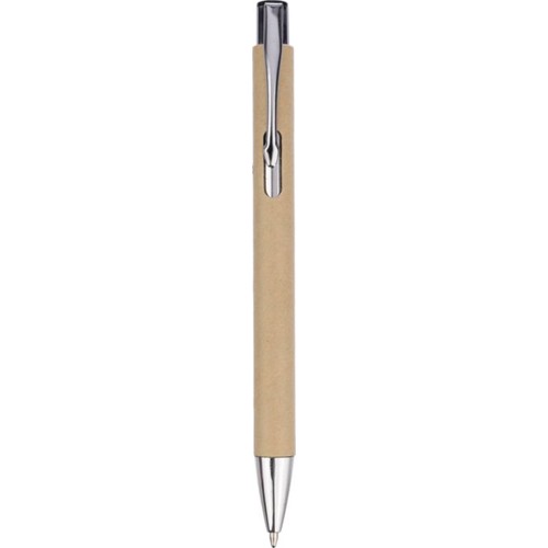 Esferográfica em cartão reciclado com detalhes cromados. Ponta e botão de pressão em plástico, e clip em metal. Aprox. 800 metros de comprimento de escrita. Tinta preta. Colors : azul claro Materials : Recycled paper.