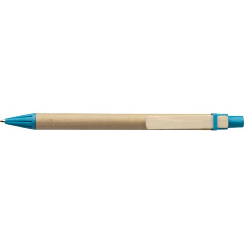 Esferográfica com corpo de cartão, clip de madeira e botão em plástico. Escrita azul. Colors : cor-de-laranja Materials : ABS/Cartão Certificates : Cadmium (nr 2), PAHs (nr 4), Phthalates (nr 13), PCP (nr 39), Safety Data Sheet (SDS) (nr 27), EN71-3 (nr 1), Lead (nr 19), BSCI (nr 195).