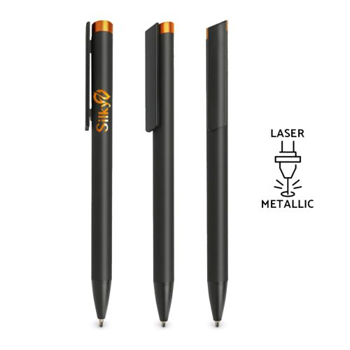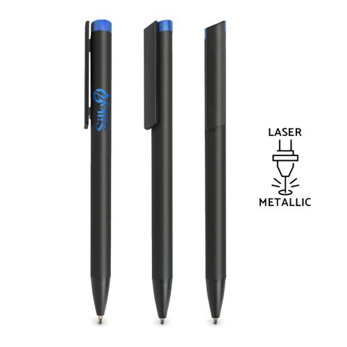 Esferográfica em alumínio com toque de borracha. Escrita azul, sistema pulsar. Esferográfica com clip em plástico e topo colorido brilhante. Clip com área de destaque para gravação. Destaque a sua marca com esta caneta. Ao personalizar a laser, a gravação sai à cor do topo. Brilhante no design e na personalização.