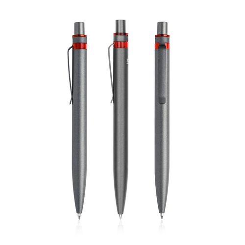Esferográfica em alumínio reciclado, detalhe colorido. Feita em alumínio reciclado de desperdício e em fim de vida útil, utilizando processos de derretimento e aproveitamento. Ao comprar esta esferográfica, está a ajudar a reduzir as libertações de carbono e a reduzir o lixo derivado da não reutilização.