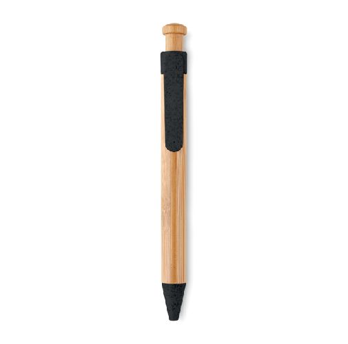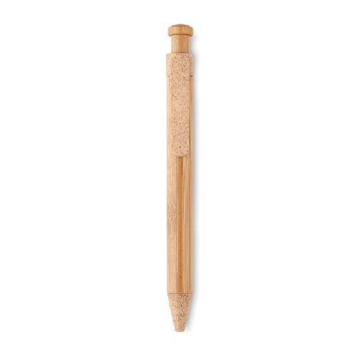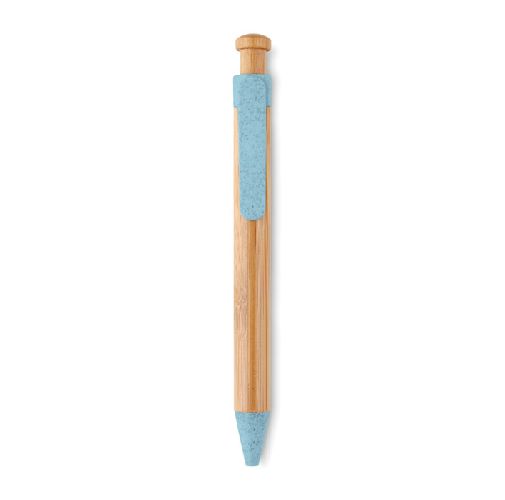 Esferográfica de botão com corpo em bambu. Clip e pontas jogo fabricados em ABS 50% e palha 50%. Tinta azul.