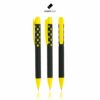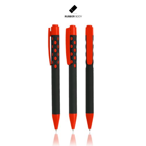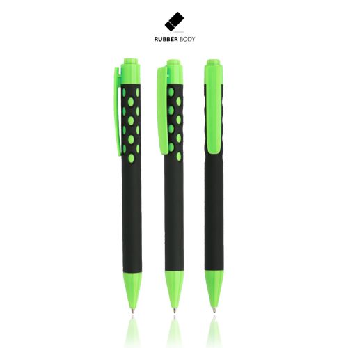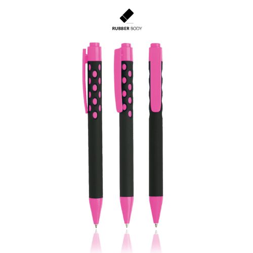 Esferográfica em plástico, acabamento em borracha. O clip largo é ideal para divulgar a sua marca. Os círculos coloridos em conjunto com o corpo com toque de borracha, tornam esta esferográfica apelativa e diferente. Os detalhes de cor podem encontrar-se nos círculos, no clip e na ponta. Com sistema pulsar. Esta esferográfica é de escrita azul.