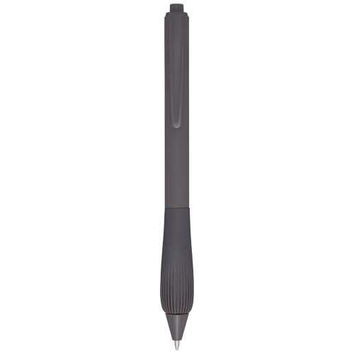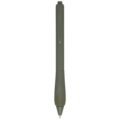 Esferográfica de plástico reciclado com corpo de borracha e cabo de TPR. Cor da tinta: Preto. Comprimento de escrita: 1000 metros. Tamanho do bico: 1,0 mm. Materials : Plástico ABS reciclado Certificates :BSCI Green Points Total :33 – CO2 foot print : 0,02 Printing default : Tampografia – corpo – max color : 4 – 60 x 6 mm