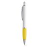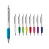Esferográfica com clipe e apontamentos em metal. Com antideslizante colorido e corpo em branco. Disponível numa variada gama de cores. Escrita a preto. ø12 x 140 mmProperties : Escrita a pretoMaterials : PlásticoCertificates : MSDS, REACH Default customisation : Esferográfica – Corpo (UV Digital – 35 x 7).