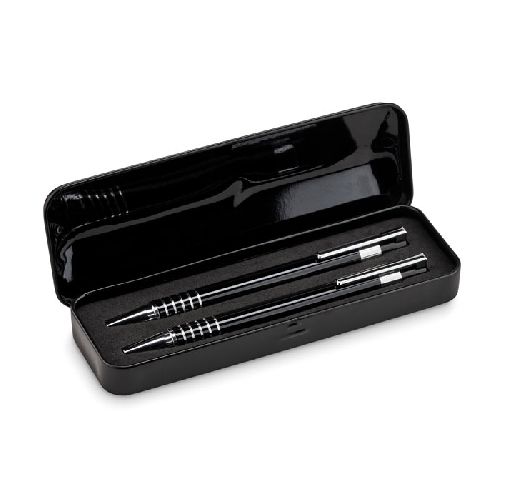 Set de esferográfica de alumínio, inclui esferográfica automática com tinta azul e lapiseira, apresentado numa caixa de metal a conjunto.