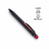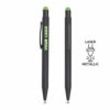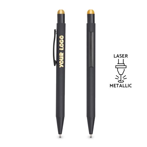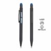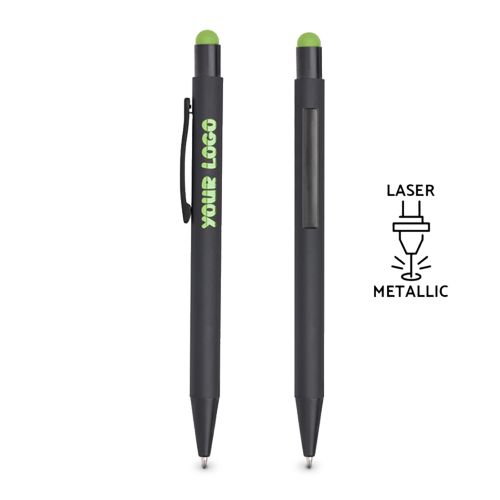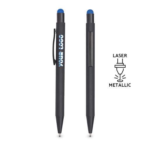 Esferográfica em alumínio com acabamento em borracha e touch colorido. O toque de borracha cria condições favoráveis para se tornar numa esferográfica agradável de usar. Destaque para o touch colorido no topo, que lhe atribuí versatilidade. Perfeita para personalização a laser, já que verá o efeito da gravação ficar a combinar com a cor do touch. Com sistema pulsar. Esta esferográfica é de escrita azul.