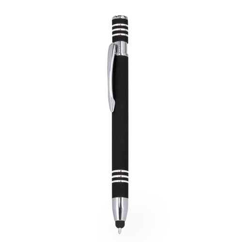 Caneta esferográfica com mecanismo de pressão e ponteira para toque, feita de alumínio. Acabamento emborrachado, especialmente projetado para personalização a laser, revelando o logotipo em tom prateado. Acessórios cromados e clipe correspondente incluídos. Tinta azul. Composition : Alumínio. Acabamento de Borracha.