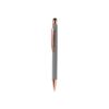 Esferográfica ponteiro de toque aborrachado especialmente desenhada para gravação a laser com logotipo de cor rosado. De mecanismo pulsador, com clip metálico e acessórios com acabamento cobre. Corpo disponível em 4 cores distintas, de carga jumbo e tinta azul.Apresentada numa elegante caixa de design preta.Carga JumboComposition : Alumínio.