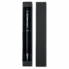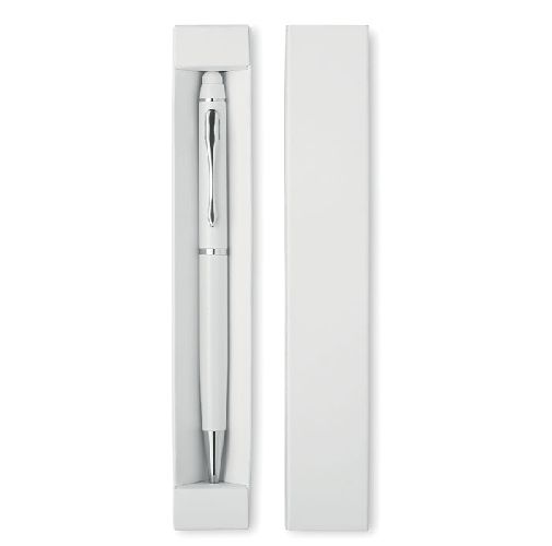 Esferográfica giratória em alumínio com ponta táctil. Escrita azul. Apresentada em caixa de papel.