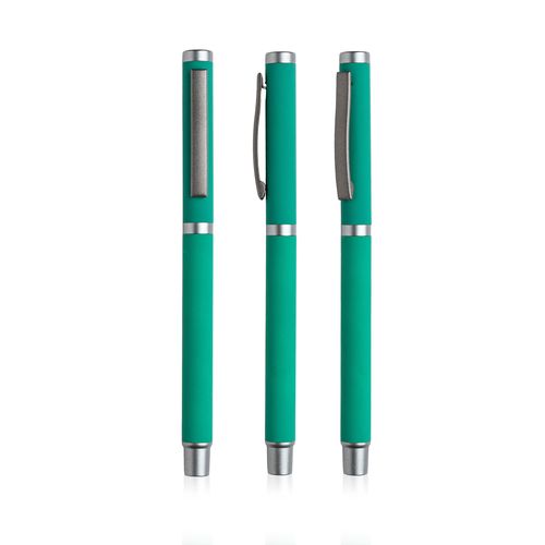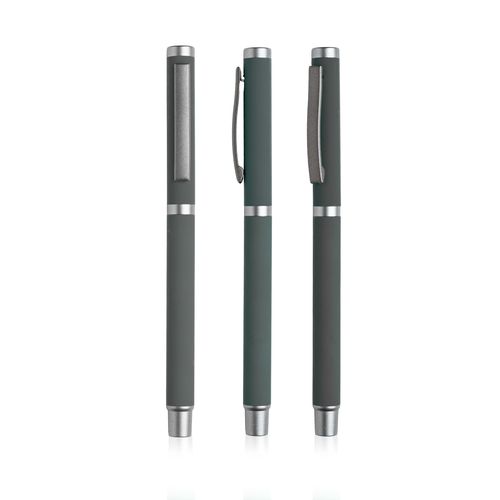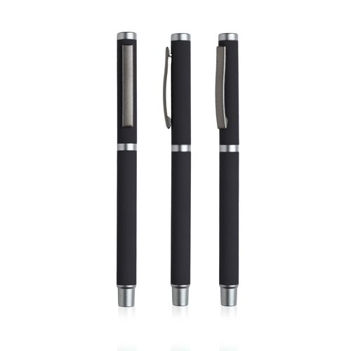 Roller em metal com toque de borracha. Roller moderna com corpo emborrachado e a resistência e qualidade de uma roller de metal. Com uma coleção de cores completa, esta roller alia-se a qualquer campanha de brindes, com a gravação da sua marca. Sistema de tampa e escrita azul.