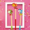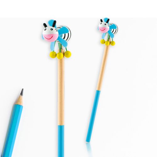 Lápis de carvão infantil. Um lápis de corpo bicolor, com figuras divertidas no topo. Cada cor tem uma figura diferente. Dê asas à imaginação de forma divertida. Personalize-o e torne este brinde ainda mais especial.