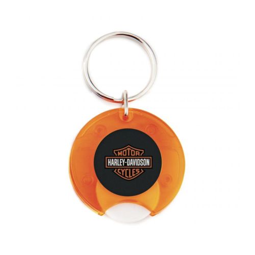 Porta-chaves CR-25 em acrílico com moeda € para carrinho compras. Com 1 face (Ø25mm) para inserção de papel e fecha com uma tampa em acrílico.