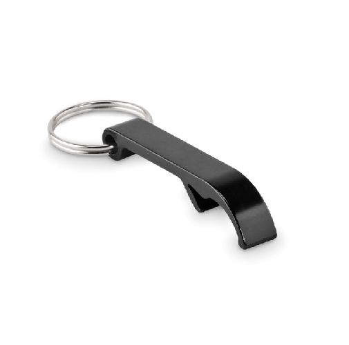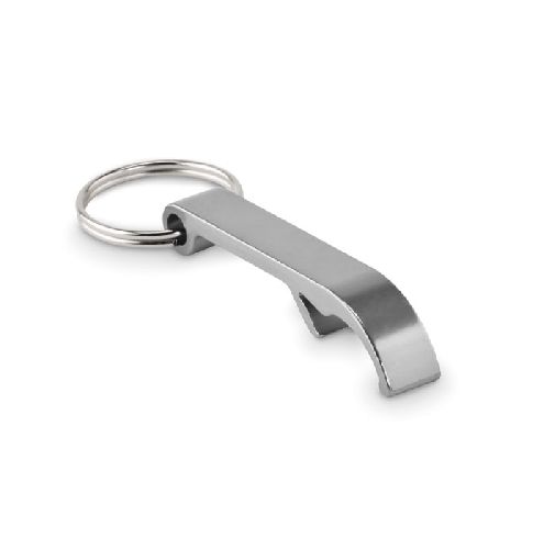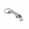 Abre-garrafas de porta-chaves em alumínio reciclado com acabamento brilhante.