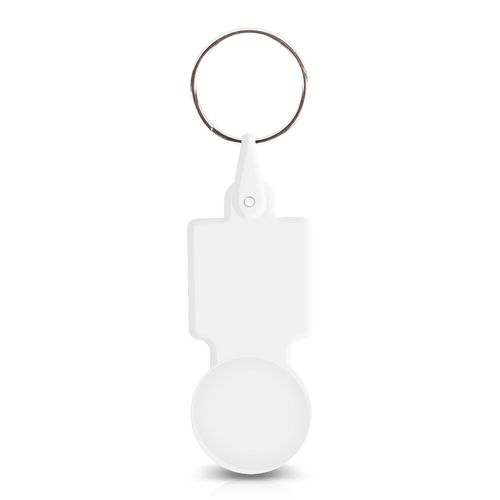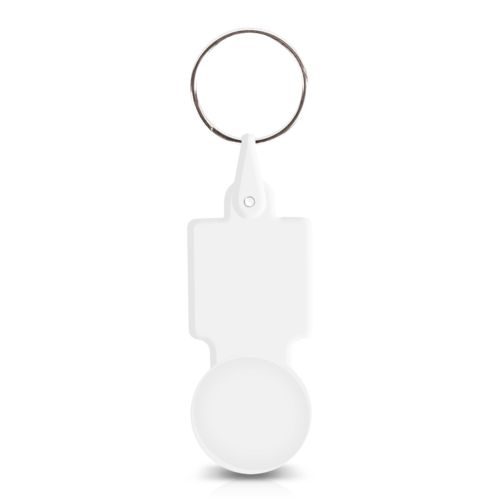Porta-chaves com ficha € 0,50 para carrinho, plástico PS. Muito útil para compras de supermercado, este brinde tem uma face que pode personalizar com o seu logo.