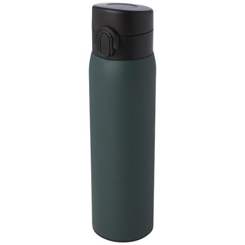 Elegante frasco isolado em aço inoxidável reciclado com certificação RCS e um mecanismo de abertura fácil por botão. O frasco é à prova de vazamentos e com o isolamento a vácuo de cobre as bebidas mantêm-se quentes ou frias por várias horas. Capacidade volumétrica de 450 ml. Apresentada numa caixa de presente de cartão reciclado.Recycled stainless steel, Recycled PP Plastic Green Points Total :54 – CO2 foot print : 0,86Tampografia – frontal – max color : 4 – 25 x 70 mm.