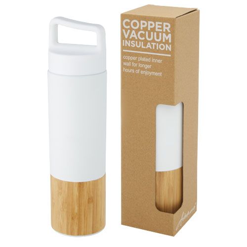 Garrafa de aço inoxidável 18/8 de cobre isolada a vácuo que mantém as bebidas quentes ou frias durante várias horas. Apresenta um detalhe de bambu atual, e com a pega em cima da tampa é fácil de transportar. A garrafa tem uma abertura larga que facilita o seu enchimento e limpeza. Testado e aprovado sob a Legislação Alemã de Segurança Alimentar (LFGB), e testado para conteúdo de ftalatos de acordo com os regulamentos REACH. Capacidade de 540 ml. Apresentada numa caixa de presente branca de cartão.Aço inoxidável, Madeira de bambu Green Points Total :14 – CO2 foot print : 2,319Tampografia – frontal – max color : 4 – 30 x 70 mm.