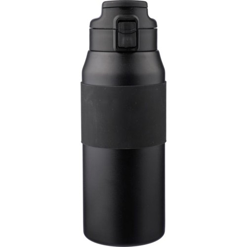 Garrafa em aço inoxidável de parede dupla (800 ml) com uma pega de silicone no corpo, palhinha, tampa PP e pega de transporte. Fabricada em aço inoxidável 304. Botão de pressão para abrir ou fechar o bico. Mantém o conteúdo quente durante 8 horas e frio durante 12 horas. Apresentada individualmente numa caixa de cartão castanha. Colors : azul Materials : PP/Aço Inoxidável 201/Aço Inoxidável 304/Silicone.