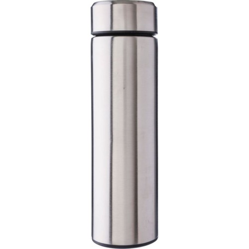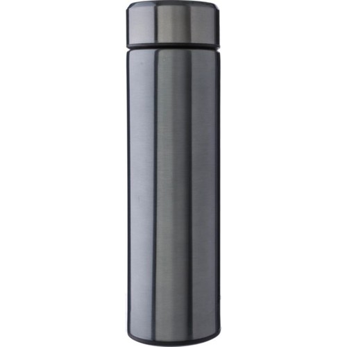 Garrafa térmica de aço inoxidável de parede dupla (425 ml) com um coador de chá incorporado e removível. O interior é feito de aço inoxidável 304 e o exterior é de aço inoxidável 201. Apresentada individualmente numa caixa de cartão castanha. Colors : preto Materials : Aço Inoxidável 201/Aço Inoxidável 304.