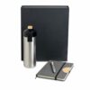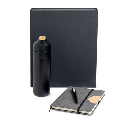 Kit – Garrafa térmica, esferográfica e bloco em caixa oferta. Um Kit completo que é ideal para diversas ocasiões. Seja como Kit de boas vindas ou até como prenda de Natal, este conjunto em caixa preta incluí uma garrafa térmica (370617), um bloco de notas (250581) e uma esferográfica (131521). O elemento que liga os 3 brindes é o bambu, posicionado de forma elegante e ideal para a personalização.Os elementos constutuintes são vendidos também em separado (excepto a caixa).