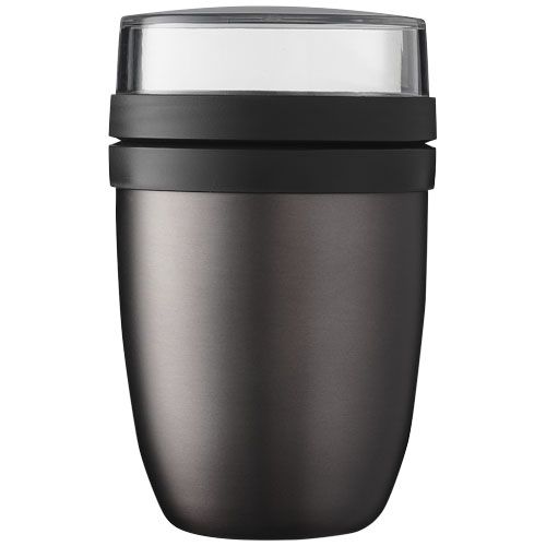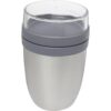 Lancheira com dois compartimentos diferentes para manter os diferentes ingredientes separados. Ambos os recipientes têm uma tampa separada para que os ingredientes não se misturem. Mantém as bebidas quentes durante 10 horas e frias durante 16 horas. Para garantir que os alimentos permaneçam quentes ou frios durante o máximo de tempo possível, é recomendável lavar a lancheira com água quente ou gelada antes de encher. O teor do recipiente transparente superior é de 200 ml, o que significa que pode conter cerca de 75 gramas de alimentos sólidos. A capacidade do recipiente inferior é de 500 ml. Feita de material durável e o exterior da lancheira permanece fresco e seco. Recomenda-se a lavagem à mão. As partes de plástico da tampa podem ser colocadas na máquina de lavar loiça. À prova de vazamento. Sem BPA.Plástico PP , Aço inoxidável, PCTG Plastic Green Points Total :8 – CO2 foot print : 2,008Tampografia – frontal – max color : 4 – 25 x 50 mm.