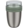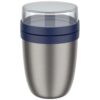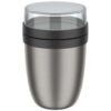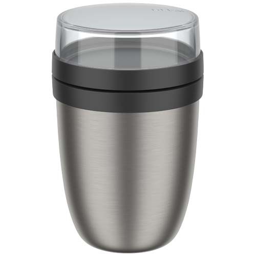 Marmita isotérmica com dois compartimentos diferentes para manter os diferentes ingredientes separados. Ambos os recipientes têm tampas separadas para que os ingredientes não se misturem. Mantém a comida quente durante 6-8 horas ou fria durante 12 horas. O conteúdo do recipiente superior transparente é de 200 ml. A capacidade do recipiente inferior é de 500 ml. É feito de material durável e o exterior da marmita permanece fresco e seco. Recomenda-se lavar à mão. As partes plásticas da tampa podem ser colocadas na máquina de lavar louça. Materials : Aço inoxidável Default print option : Gravação laser – frontal – max color : 1 – 25 x 30 mm Para este produto, o fornecedor concluiu todos ou parte dos dados GPSR. Para mais informações, contacte o fornecedor.