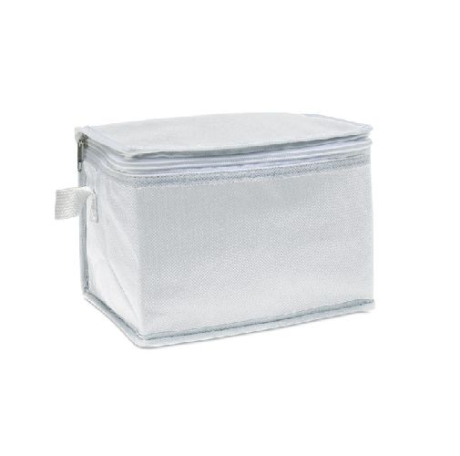 Saco térmico de folha de alumínio para 6 latas. Exterior em non woven com guarnições brancas. 80 gr / m. Material de Isolamento: Espuma com laminado de papel de alumínio. 3L.