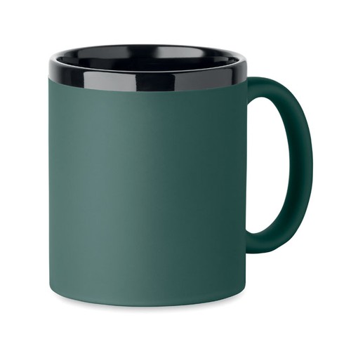 Caneca de cerâmica com revestimento suave ao toque e interior/borda pretos. Com um revestimento especial para gravação a laser. Capacidade: 300 ml. Embalagem individual em caixa de cartão branco.
