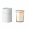 Vela perfumada de baunilha em recipiente de vidro de 8 cm de diâmetro com tampa em bambu. Apresentada em caixa oferta de papel.