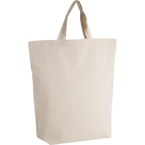 Parte inferior larga com divisória, ideal para economizar espaço. Alças curtas mais resistentes para o transporte de cargas pesadas. Alças a condizer com o saco. Saco de compras em algodão com fundo largo e fole, alças de 35 cm no mesmo material e cor.