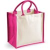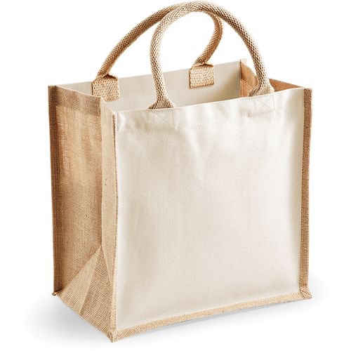 Superfícies lisas em algodão, ideais para impressão e serigrafia. Juta resistente e ecológica. Alças em algodão confortáveis para o dia-a-dia. Saco em juta laminado e malha de algodão, pegas em algodão (comprimento: 40 cm), parte lateral em malha que permite a impressão.