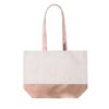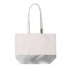 Saco em material 100% algodão reciclado de 220 g/m2 numa combinação com polipele metalizada. Com fole e asas compridas de 70 cm, disponíveis em dourado, prateado e dourado rosa, com base a condizer. Resistência até 8 kg de peso.Composition : Algodão/ Polipele.