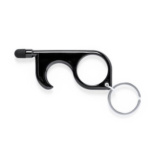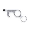 Porta-chaves higiénico anti-contato com esferográfica e pontero integrados. Fabricado em resistente ABS de acabamento metalizado e disponível numa variada gama de cores. Especialmente desenhado para evitar tocar com as mãos superficies de uso comum (maçanetas de portas, interruptores, torneiras de uso público, caixas multibanco…). Com cómodo recorte para o dedo e apresentado em bolsa individual de desenho. Recomendado para impressão em tampografia.Esferográfica Ponteiro Incluída