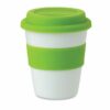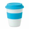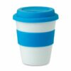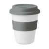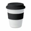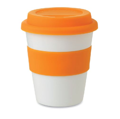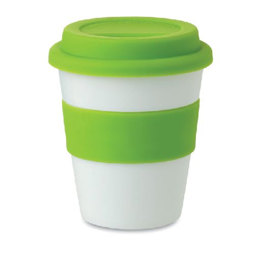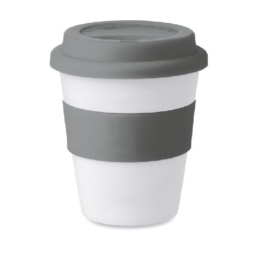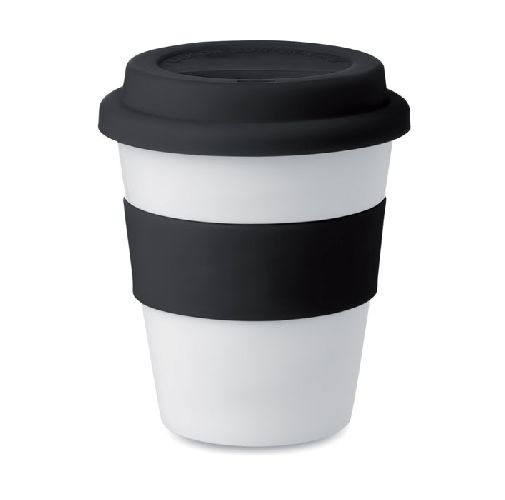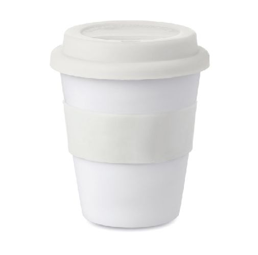 Copo de parede simples em PP branco brilhante com tampa de silicone e anel do meio. Capacidade 350 ml. Como se trata de uma caneca de parede única, a transferência de calor ainda pode ocorrer.