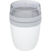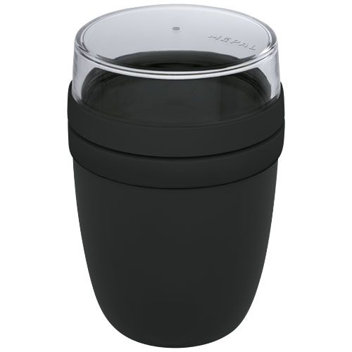 Marmita com dois compartimentos diferentes para manter os diferentes ingredientes separados. Ambos os recipientes têm uma tampa separada e, portanto, permanecem limpos. O teor do recipiente transparente superior é de 200 ml, o que significa que pode conter cerca de 75 gramas de alimentos sólidos. A capacidade do recipiente inferior é de 500 ml. Produzido em material durável e pode ser utilizado no congelador, no micro-ondas (remova a tampa) e na máquina de lavar louça. O recipiente transparente superior não deve ser utilizado no micro-ondas. À prova de vazamento. Sem BPA.Este artigo está disponível com uma manga de papel digital personalizada á volta da caixa de oferta.Plástico PP , PCTG Plastic Green Points Total :13 – CO2 foot print : 1,193Tampografia – corpo – max color : 4 – 25 x 50 mm.