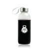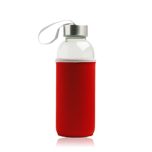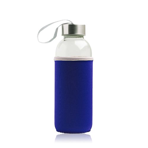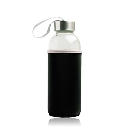 Garrafa em vidro 430ml, com tampa em metal e manga em neopreno. As garrafas de plástico não reutilizáveis estão cada vez mais démodé. A pensar nisso, e no meio ambiente, surge esta garrafa de vidro que pode usar quantas vezes quiser. Com tampa em metal e atilho. A manga em neopreno é ótima para tornar esta garrafa numa personalização única e especial.