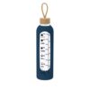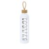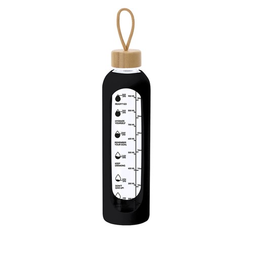 Garrafa fabricada em vidro de 1L de capacidade, projetada para fomentar uma hidratação adequada. Recoberta com capa de silicone que protege e fornece um agarre confortável e seguro.Inclui indicador de capacidade em litros e onças, acompanhado de frases motivadoras que inspiram a manter uma correta hidratação diária. Tampa, elaborada em bambu, inclui prático cordão para facilitar seu transporte. Livre de BPA. 1 L. Bolsa Silicone Composition : Vidro/ Bambu.