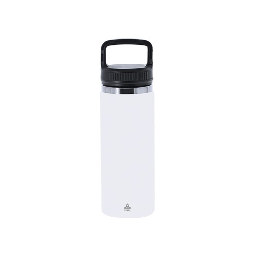 Garrafa térmica de 550 ml de capacidade, fabricada em aço inox reciclado de dupla parede. Conta com uma alça funcional com dupla função de mosquetão, que facilita um transporte confortável e versátil. Com tampa de rosca e base na cor fosca, complementada com um elegante aro decorativo em prata. Livre de BPA.O aço é um dos materiais mais demandados e pode ser encontrado quase em todos os lugares, desde produtos de uso diário até grandes construções. Com inúmeras propriedades, entre as quais se destaca a durabilidade e seu alto grau de reutilização, tornando-se uma alternativa muito valorizada em soluções de sustentabilidade. Devidamente tratado, permite obter novos recursos de infinita utilização. 550 ml Composition : Aço Inox Reciclado.