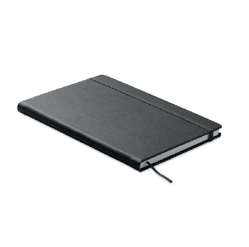 Bloco de notas A5 com tampa de PU duro. 192 páginas forradas (96 folhas) em papel reciclado (80 gsm). Fecho elástico e fita marcador de página . Fabricado na UE.