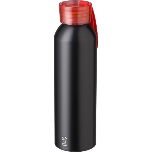 Garrafa de alumínio reciclado (650 ml) com acabamento mate, tampa PS de cor transparente e fita de silicone a condizer. Adequada apenas para água fria. Logótipo reciclado gravado na garrafa.Material : Alumínio, PS, PP, Silicone.