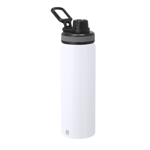 Garrafa de alumínio reciclado com capacidade de 800 ml. Fornecida com tampa de rosca preta com pega em silicone cinza para vedação ideal, dispensador e alça de transporte ajustável. Com logotipo de alumínio reciclado.O alumínio reciclado é um material com possibilidades de reciclagem quase infinitas, sem perder suas propriedades originais e consumindo menos energia no processo.Certificação GRS (Global Recycled Standard), garantindo a origem reciclada do material utilizado para fabricar o produto. 800 ml Composition : Alumínio Reciclado.