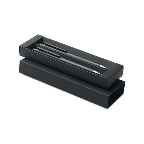 Conjunto de canetas em alumínio reciclado com 1 esferográfica de pressão e 1 caneta de grafite sem tinta. Tinta azul. Apresentado numa caixa de papel reciclado. Dimensions : 17,3X5,2X2,2 CM